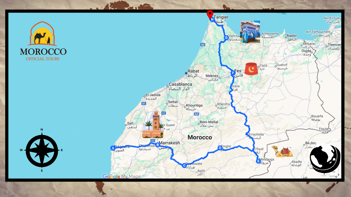 The tour lasts 10 days and 9 nights, covering Marrakech, the Sahara Desert, Fes, Chefchaouen, and Tangier.