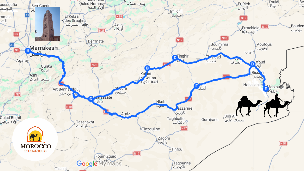 Wake up early to witness the sunrise over the dunes Enjoy a warm Moroccan breakfast Return by camel or 4×4 Jeep to Merzouga where your driver awaits Continue to Rissani known for its large ethnic souk Travel to Alnif and along the Draa Valley lined with palm trees and ancient Kasbahs Cross Tizi Tinififft pass to reach Ouarzazate the Hollywood of Africa Continue via Tizi-n-Tichka pass back to Marrakech Drop off at your accommodation or airport.