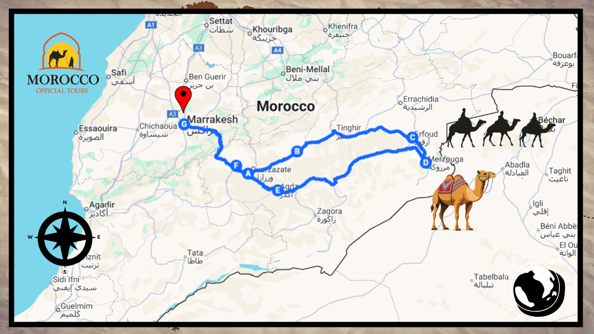 3 Days tour from Ouarzazate to Marrakech Experience the magic of the Moroccan desert This unforgettable journey combines adventure culture and breathtaking landscapes perfect for travelers who want to explore the highlights of southern Morocco in just three days your Ouarzazate Marrakech 3 day tour begins with a scenic drive to the stunning Todra Gorges where dramatic cliffs create a spectacular natural setting From there continue to the golden sands of the Merzouga Sahara Desert where you’ll ride camels watch the mesmerizing sunset and spend a night under the stars in a comfortable desert camp.